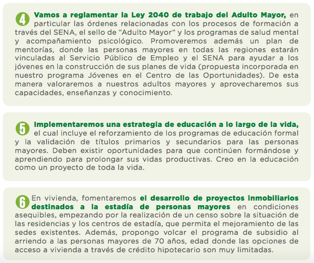 Las necesidades diferenciadas de la población de adultos mayores en materia de ingresos, salud, educación, recreación, han tenido una muy tímida mirada desde la política pública. Se destaca la expedición reciente de la Ley 2040 que ofrece incentivos y garantías para el trabajo de personas mayores. Sin embargo, no se cuenta actualmente con una mirada integral de la situación de los adultos mayores. Los retos siguen siendo enormes desde la dependencia económica, la baja protección social, la discriminación y el abuso en sus diversas dimensiones. Si se tiene en cuenta que la transición demográfica hará que en 2050 un tercio de la población colombiana sea mayor de 60 años, la atención a las personas mayores debe ser una prioridad del presente y del futuro. Como sociedad, debemos prepararnos para envejecer.