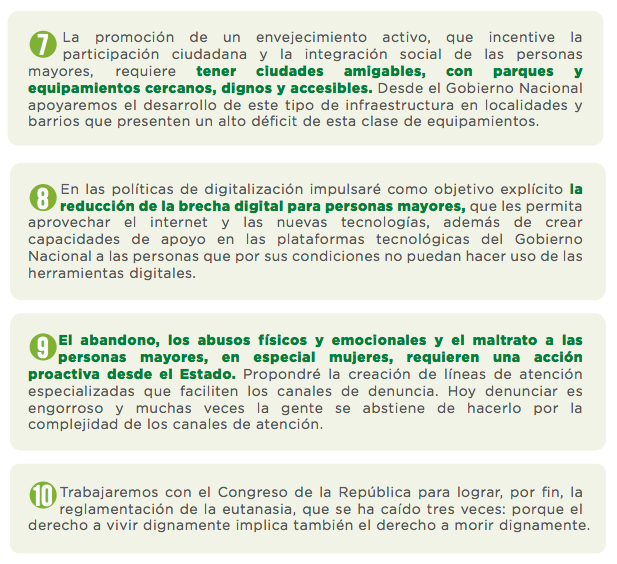 Por ende, este reto de sociedad puede empezar a enfrentarse con las siguientes diez propuestas para construir una red de protección social integral para las personas mayores, que irá de la mano de un Sistema Nacional de Cuidados en Colombia: