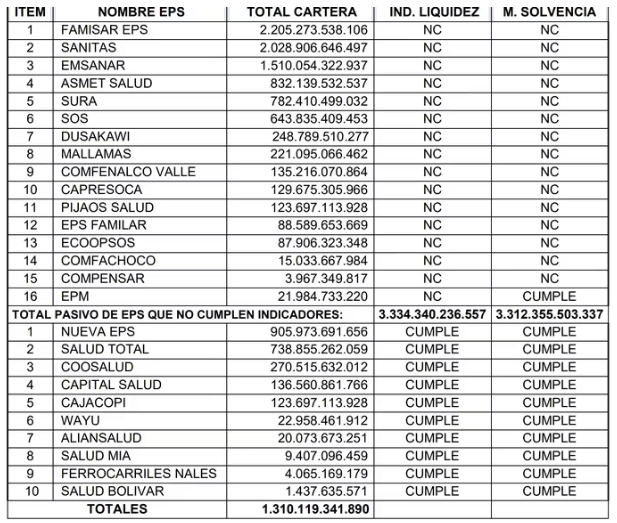 “Salud Bolívar, Fundación Salud Mía, EPM Salud, Coosalud, Aliansalud, Ferrocarriles Nacionales, Capital Salud, Mutual Ser, Anas Wayuu EPSI, Salud Total EPS y Nueva EPS. Son las mismas aseguradoras que presentan indicador de liquidez satisfactorio, lo que permite concluir que su situación financiera es satisfactoria y pueden garantizar la prestación del servicio de salud a sus afiliados”, señaló la Contraloría.