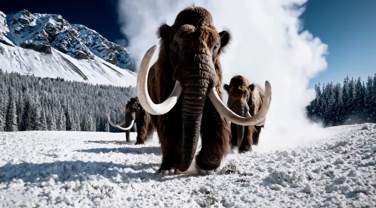Video generado por IA realizado con el mensaje “varios mamuts lanudos gigantes se acercan caminando por un prado nevado, su largo pelaje lanudo ondea ligeramente con el viento mientras caminan, árboles cubiertos de nieve y espectaculares montañas cubiertas de nieve en la distancia, luz de media tarde con tenues Las nubes y un sol en lo alto en la distancia crean un brillo cálido, la vista baja de la cámara es impresionante y captura al gran mamífero peludo con hermosas fotografías y profundidad de campo”.CORTESÍA DE OPENAI