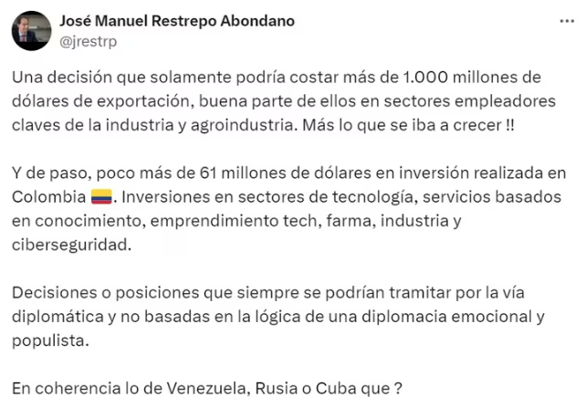 “Decisiones o posiciones que siempre se podrían tramitar por la vía diplomática y no basadas en la lógica de una diplomacia emocional y populista. ¿En coherencia lo de Venezuela, Rusia o Cuba?”, cuestionó José Manuel Restrepo.
