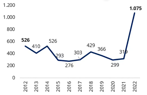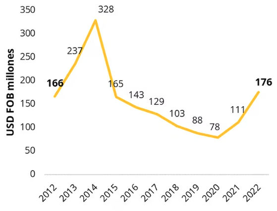 Desde 2012 hasta 2022, se observa un comportamiento irregular en el valor de las exportaciones, debido al principalmente a los precios internacionales de los productos minero-energéticos.
