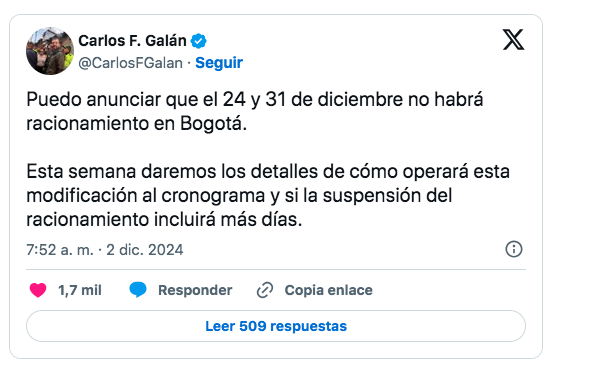 “Puedo anunciar que el 24 y 31 de diciembre no habrá racionamiento en Bogotá. Esta semana daremos los detalles de cómo operará esta modificación al cronograma y si la suspensión del racionamiento incluirá más días”, anunció el alcalde Carlos Fernando Galán, en su cuenta de X.